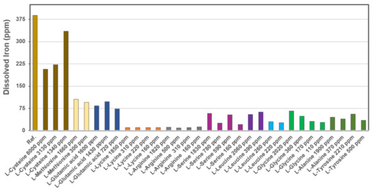 Figure 1 shows the dissolved iron concentration after immersion of the mild steel rods in UCO2 with various concentrations of the amino acids tested as corrosion inhibitors. Although significant differences were measured between the different amino acids’ corrosion-inhibiting effects, all amino acids decreased the amount of iron dissolved to UCO2 during the three-day immersion. These results are in accordance with the published results of utilizing amino acids and their derivatives to prevent corrosion of metals and alloys in aqueous media [11,21]. Interestingly, a particular amino acid concentration did not have a marked impact on the iron concentration analyzed in the oil. The best corrosion inhibition was achieved with the cationic acids L-lycine and L-arginine. Low concentrations of these two amino acids almost totally inhibited the corrosion.
