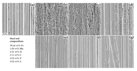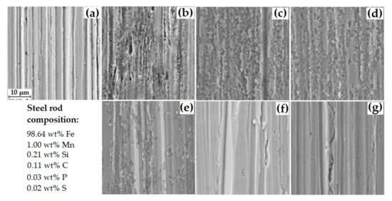 Figure 2 shows SEM secondary electron images of polished steel rod surfaces after immersion in UCO2 and the different amino acids. Figure 2a shows the polishing scratches on the rod surface before the exposure. After the immersions, the surface morphologies were smoother (Figure 2b–e). The immersion affected the surface morphology of the rods for all other UCO2 additives but L-lycine (Figure 2f) and L-arginine (Figure 2g). Thus, the images suggest only minor corrosion, further supported by low iron concentrations in UCO2, around 10 ppm Fe with L-lycine and 12 ppm Fe with L-arginine.