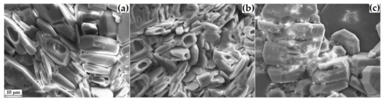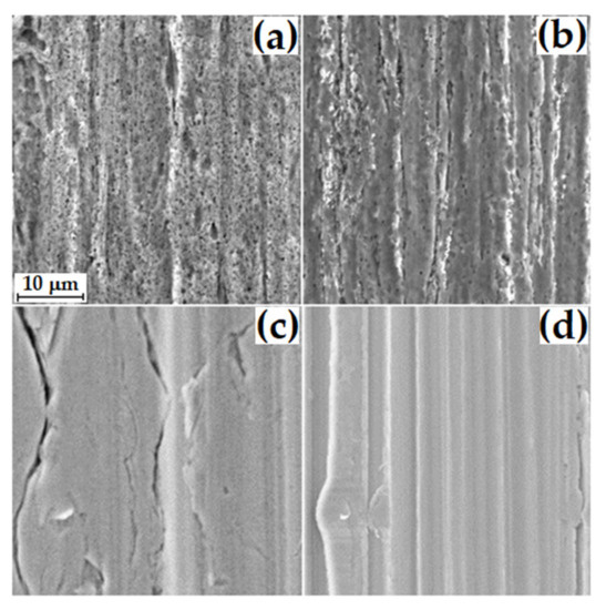 SEM images of rod surfaces after immersion in oils with formic acid (10,000 ppm), water (10,000 ppm), and L-lycine (300 ppm): (a) UCO6, (b) UCO7, and (c) UCO8. The magnification is the same for all images.