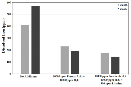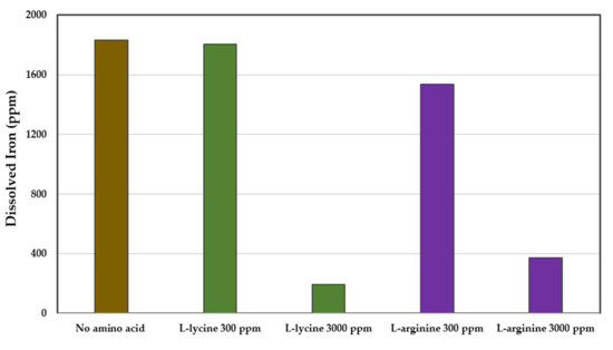 Adding 300 ppm L-lycine to UCO6, UCO7, and UCO8 decreased the iron dissolution to 15–20 ppm. Similarly, 300 ppm L-arginine in UCO6, UCO7, and UCO8 decreased the dissolved iron concentration to 22–44 ppm.