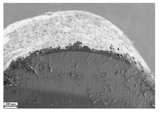 SEM-EDS analysis suggested that the layer consisted mainly of carbon and oxygen, with some iron and manganese. The rod cross-section was revealed by BIB cutting for the SEM analysis. According to the image analysis, the layer mean thickness was 46 µm (Figure 7).