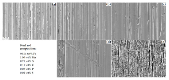 SEM images of steel surfaces: (a) before immersion, and after three days in (b) rapeseed oil, (c) rapeseed oil + 10,000 ppm water, (d) rapeseed oil + 10,000 propionic acid, and (e) rapeseed oil + 10,000 propionic acid + 10,000 ppm water. The magnification is the same in all images.