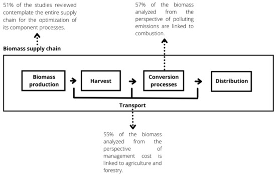 Supply chain systems are made up of means and methods that allow the efficient implementation and control of materials and products from the point of origin to consumption. Their purpose is the integration of processes to obtain environmental, social, and economic benefits. As there is a significant source for the use of biomass, the sustainability of the supply chain involves various decisions and points of analysis with questions such as the type of biomass to select, how much and where to take it, what production technology to install, where to locate the centers of use, and with what capacity and which market to satisfy in order to favor the cost–benefit ratio [79]. In general, a sustainable supply chain suggests consideration of the economic performance, environmental impact, and social benefit of supply operations, as argued by Nguyen [80].