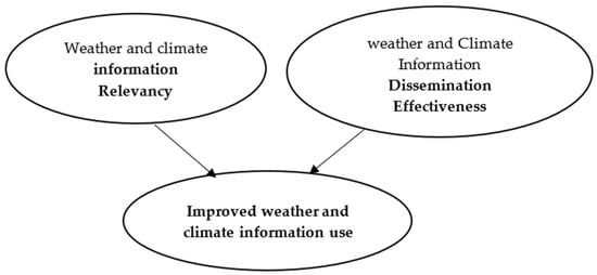 Information is knowledge obtained from investigation, study, or instruction. It is a form of organized or classified data with meaningful values for the receiver. When communication provides meaning to the receiver, it is said to be effective. Effectiveness is the capability of producing a desired result or the ability to produce a desired output. Relevant information means information that pertains to the matter or problem at hand and is directly connected with effective communication. Information is considered relevant if it is important and useful, such as pertinent, valuable, of utility, applicable, helpful, appropriate, significant, topical, correspondence, fit, bearing, matching [26]. User perceptions determine the usefulness of weather information including; the complexity of weather information, packaging of information, accuracy and scale of forecasts, interpretation of the information, and timing among others. It is therefore important that all aspects of information be considered to ensure that its purpose is met. For instance, the provision of high-quality weather data is not a guarantee that communities benefit from weather information. Weather information dissemination is key to realizing the full potential of the weather and climate information to support communities in adapting to climate change. In this study weather, information was made available through the WIDS application [28]. People-related factors, such as: farmers’ ICT literacy, level of awareness and education, motivation, and attitude towards the information itself and source, affect the level of use of the information [29]. The study sought to assess the levels of effectiveness and determinants of the effectiveness of weather information dissemination methods amongst farmers and policymakers/service providers. Figure 1 shows the conceptual framework, which guided the study whereby the relevancy of weather and climate information coupled with the effectiveness of dissemination leads to the desired result; that is, using the information for better outcomes.