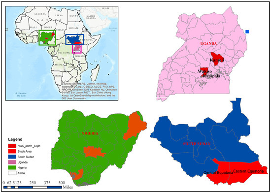 The study area: Uganda (in Wakiso, Kampala and Kamuli districts), South Sudan (in East equatorial and Central equatorial) and Nigeria (in Borno, FCT Abuja and Delta states).