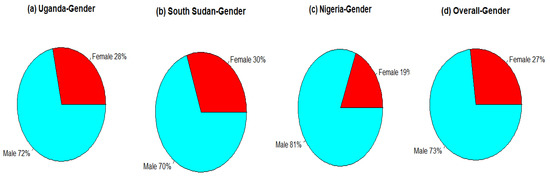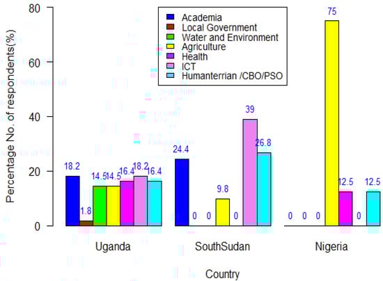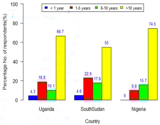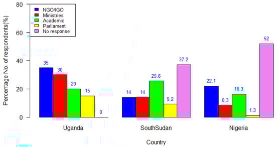 From the data collected, the majority of the respondents were males (Figure 3) and had been living in the location for more than 10 years (66.7% in Uganda, 55% in South Sudan, and 74.5% in Nigeria) (Figure 4) and thus expected to have a good knowledge of the climatology, geography and policies of their particular region. The demographic distribution of policy makers and other actors is provided in Figure 5.