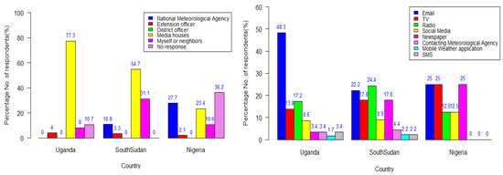 The results regarding access of weather information shows that more than 60% of the recipients (85.5% in Uganda, 72.2% in South Sudan and 65.3% in Nigeria) are able to access weather information (Figure 6). The results further show that the most common channel of receiving weather information is through media houses (Uganda: 77.3%; South Sudan: 54.7%; and Nigeria: 23.4%) (Figure 7 left). Most of the policy makers in Uganda and Nigeria received weather information via email whereas in S. Sudan the information is received via local government officers (Figure 7 right).