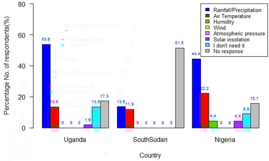 Percentage of respondents (policy makers) and the weather parameters they observe/require, organized by country.