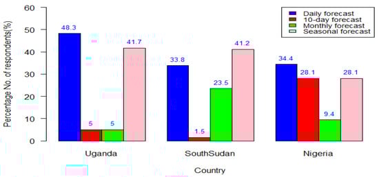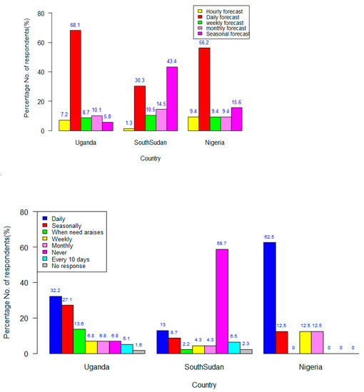 The changing environment, climate, and the increasing manifestation of disasters, has generated an increased demand for accurate and timely weather information. This information is provided by the National meteorological authorities (NMAs) through different dissemination channels e.g., using radios, Televisions, emails among others. The use of ICTs to provide weather information is recently gaining popularity. A study was conducted in three countries, namely Nigeria, Uganda, and South Sudan to assess the efficiency of an ICT tool, known as “Weather Information Dissemination System”. The study involved 254 participants (Uganda: 71; South Sudan: 133; and Nigeria: 50). The collected primary data were first quality controlled and organized thematically for detailed analysis. Descriptive statistics was used to provide quantitative analysis as well as content scrutinized for qualitative analysis. The results showed that there is a need for timely weather information to plan farming activities such as planting and application of fertilizers and pesticides as well as to manage flood and drought by the water sector and disaster management. Results further showed that the majority of the respondents have access to the technology needed to access weather and climate information. The respondents who received weather information from NMAs noted that the forecast was good. However, they further noted that there is more room for improvement especially with making the forecasts location-specific, ensuring mobile access is adequate in all regions, provision of weather information by SMS (in countries where this service is currently unavailable) and improved timing of the weather information. Finally, uncertainty about the accuracy of weather information and the weather information not meeting specific needs are key barriers to people’s willingness to pay for it (Uganda: 33.3%; South Sudan: 46.1%; and Nigeria: 33.3%). Improved collaborations between the NMAs, ICT service providers, policymakers and farmers will facilitate an effective approach to weather information access and dissemination. Innovative sensitization approaches through the media houses will enable better understanding of weather products and utilization, and access to enabling ICTs would increase access to weather forecasts
