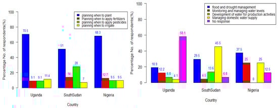 The weather information generated by the weather agencies in the three countries is used in different ways by famers and policy makers. As shown in Figure 12, farmers in all three countries mainly use the weather for planning when to plant (Uganda: 70.5%; South Sudan: 51%; and Nigeria: 68.3%). Other purposes for which weather information is used by the farmers include planning irrigation activities, fertilizer and pesticide application. Policy makers used the weather information for a variety of purposes such as flood and drought management (Nigeria: 37.5%; South Sudan: 29.5%; and Uganda: 18.9%); managing domestic water supply (South Sudan: 45.5%; Nigeria: 25%; Uganda: 4%) (Figure 12). Other purposes for which policy makers use weather information are monitoring the water levels and development of water for production activities. A significant percentage of policy makers apparently did not make any use of the weather information as they gave no response when asked about the purpose for which they used it (58.1%, 12.5% and 6.8% in Uganda, Nigeria and South Sudan; Figure 12).