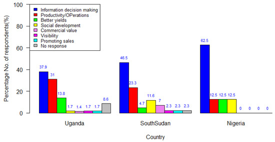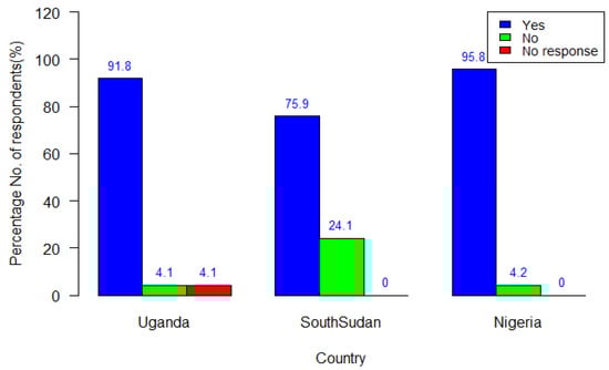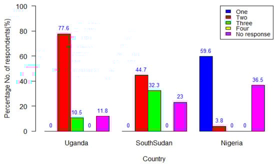 Questionnaires targeting two groups including farmers (Uganda: 71; South Sudan: 133; and Nigeria: 65) and policy makers/service providers (Uganda: 55; South Sudan: 45; and Nigeria: 5) were administered from June 2020 to late August 2020 in the three African countries, including Uganda, South Sudan and Nigeria. The farmers responded to the questionnaires during focus group discussions, while the policymakers/service providers were reached through Google forms. A minimum number of questions, which were considered by the researchers as the bare minimum for meaningful data analysis, were made mandatory for the Google form submission, while other questions were not required to be completed. Additional responses were received from both groups during scheduled webinars conducted in September 2020. Table 1 gives the distribution of farmers who responded to the questionnaire, while Table 2 is the distribution of the policymakers/service providers that participated in the study. The policy makers were from the agriculture sector, water and environment sector, health sector, ICT sector as well as the local governments. The service providers were from the ICT sector and from Academia. The humanitarian organizations (i.e., Non-Governmental Organizations (NGOs) and Community Based Organizations (CBOs)) that participated in the study were chosen on the basis of participating in the Weather information cycle especially targeting the agriculture, water resources and health sectors.