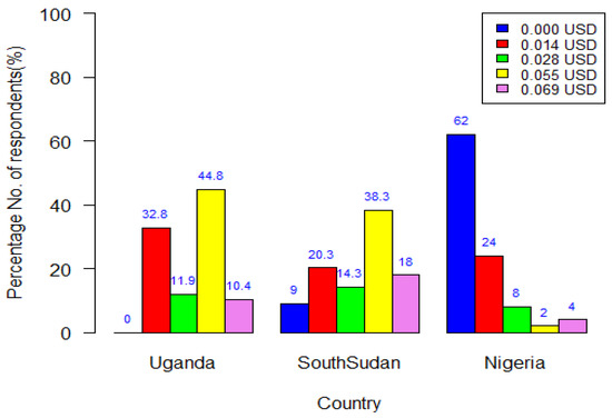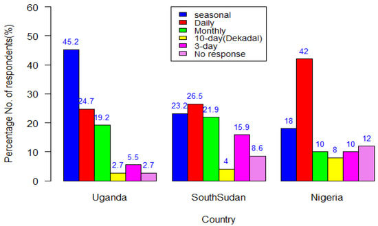 Figure 14 shows an analysis of the willingness to pay for the weather information services. The results showed that most of the respondents in all the three countries were willing to pay for daily and seasonal weather updates. In Uganda (daily: 24.7% and seasonal: 45.2 %) were willing to pay for these updates, whereas in South Sudan (daily: 26.5% and seasonal: 23.2%) and in Nigeria (daily: 42% and seasonal: 18%) were willing to pay for the updates. Additional analysis (Figure 15) shows that on average, farmers were willing to pay a fee of up to USD 0.055 (Uganda: 44.8% and South Sudan: 38.3%). Most of the Nigerian farmers (62%) were not willing to pay any fee for the current weather information. Since the farmer respondents were among those in the subsistence production category and were therefore living on a very low income, it is not surprising that a significant percentage preferred to receive weather information for free or to pay only very small amounts.