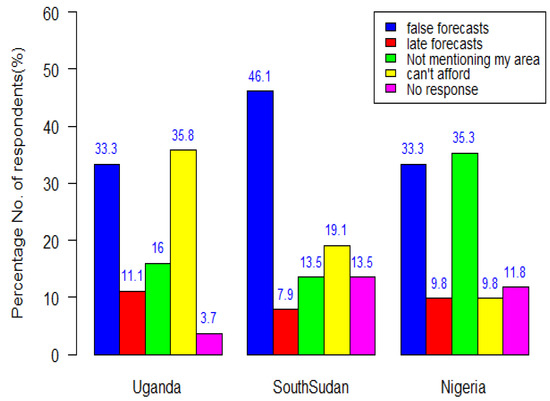 As shown in Figure 16, the most notable barriers preventing farmers’ willingness to pay for the forecasts were inaccurate forecasts (46.1%, 33.3% and 33.3% in South Sudan, Uganda and Nigeria, respectively); affordability (35.8%, 19.1% and 9.8% in Uganda, South Sudan and Nigeria, respectively); and their specific area not being monitored in the forecast (35.3%, 16% and 13.5% in Nigeria, Uganda and South Sudan, respectively).