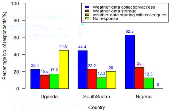 Figure 21 shows how ICT has been used for weather data collection and access, in storage of weather data and in sharing of the weather information in all three countries but mainly for weather data collection/access that is, in Uganda (22.2%), South Sudan (44.4) and in Nigeria (62.5%). A significant percentage gave no response to the use of ICT in Uganda (44.8%) and South Sudan (20%). This implies that further application of ICT could improve the weather and climate information cycle.