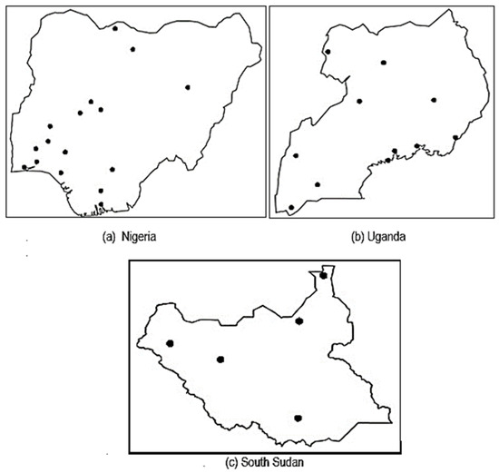 The location of synoptic stations in the three countries (i.e., Nigeria, Uganda and South Sudan). The “dots” represent the geographical location for each synoptic station.