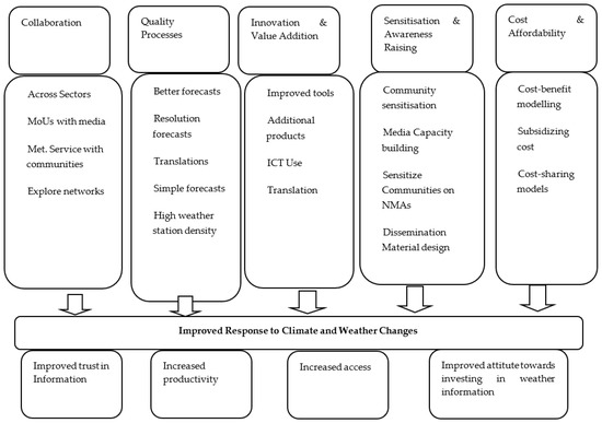 The above recommendations have been summarized in Figure 24. Their implementation has potential to improve response to weather and climate information which would be evidenced by increased information access, improved trust in the information, increased productivity and increased willingness to pay for information.