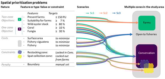 According to the different options to test, specific objectives and costs were set for each scenario using SCP. In such an approach, the costs, i.e., the constraints to minimize, were either the surface area of the zone concerned or the opportunity cost to fishers due to the loss of fishing grounds, sensu Naidoo et al. [38].
