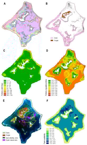 Figure 3. Spatial information on Gambier lagoon. (A). Gambier habitat map (Layer 1), including here 77 classes. Complete legend is provided in Supplementary Materials. (B). Distribution of live coral benthos and Fungia communities (from Layer 1). (C). Fishery catch aggregated by planning unit (PU) (Layer 8). (D). Fishery-ciguatera index aggregated by PU (Layer 9). (E). The extent of the present (as in BAU) farm concessions (Layer 6) overlaid on Fungia communities; extent of spat collecting zone (Layer 5) and its overlap with wild oyster stock (Layer 4). (F). Farm suitability index by PU (Layer 11). - An extensive fishery activity, estimated at 63.5 t. annual catch based on the 42 fishers surveys, who identified 252 overlapping individual fishing grounds covering 33,845 ha, which corresponds to 70% of the lagoon surface area, a spatially representative depiction of the fishery in the lagoon. A total of 128 individual zones of moderate to a high level of ciguatera risk were identified based on the fishers’ knowledge, completed with five locations of significant risk of ciguatera, identified following the fish toxicity survey conducted by ILM. The resulting risk map, combined with the fishery catch map, reflected the most favorable areas for fishing activity at a lower risk of ciguatera (Figure 3C,D). These favorable areas for fishing were mainly located on the north coast of Mangareva, the west end of Aukena, in a specific location in the middle of the northwest barrier reef near a small pass and, to a lesser extent, all along the northeast barrier reef.