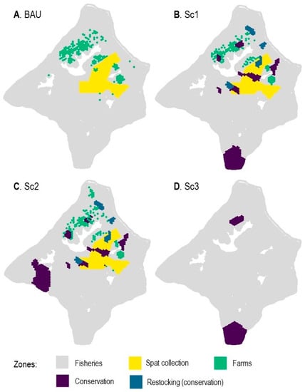 It should be noted that in these multiuse scenarios, some zones mutually exclude each other (farms, fishery, and conservation zones) while others can overlap, either partially (spat collection zone with conservation zone) or totally (restocking zones included in conservation zone). In addition, not all zones are present in all scenarios (e.g., no farms, no spat collection, nor restocking zones are part of Scenario 3).