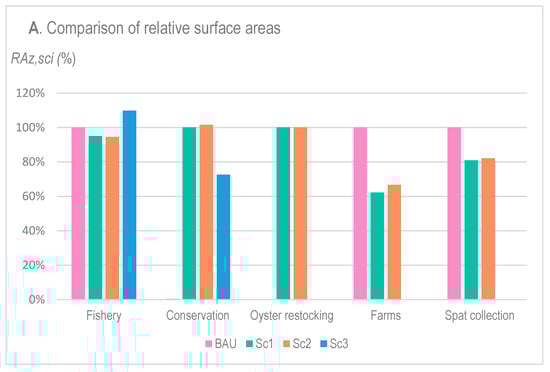 As the conservation and oyster restocking zones were absent from BAU, comparisons of surface areas and opportunity cost were made using Sc1 values as the reference for these zones.