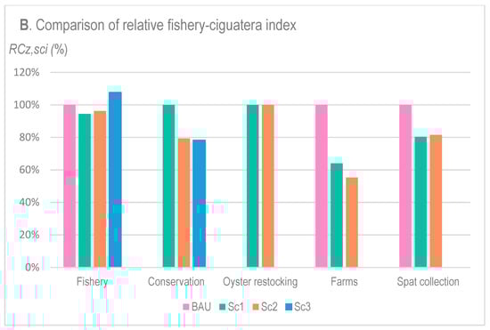 The diversification options (Sc1 and Sc2) slightly decreased the zone open to fisheries compared with BAU, while it was logically increased in Sc3, both in terms of relative surface area RA (A) and relative cost of the fishery–ciguatera index RFC (B). Indeed, the decrease in RAFishery,sci and RFCFishery,sci resulted from the creation of restocking and conservation zones on Sc1 and Sc2, which did not exist in BAU. By contrast, their increase under Sc3 was due to the inclusion of fishing zones in former concessions and spat collection areas present in BAU.