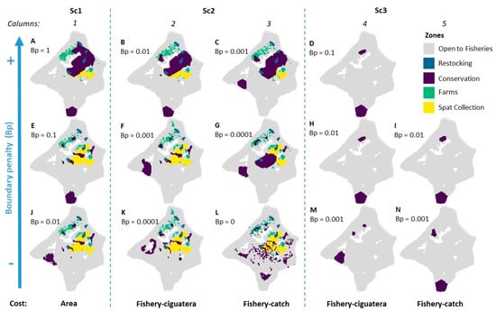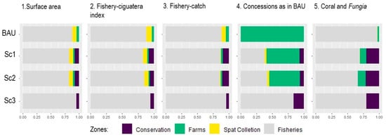 Similarly, we compared the relative opportunity cost (RFCz,sci) of the solution zone z in each scenario sci, using the combined fishery–ciguatera index (FCz,sci), in Equation (3).