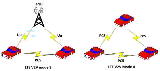 Regarding modes of operation, for LTE C-V2X, two modes of operation are introduced for V2X communications, called mode 3 and mode 4 [8]. Basically, modes 3 and 4 are an extension of D2D modes 1 and 2, standardized in Release 12. In mode 3 (managed mode), like mode 1 for D2D communications, the UE requests resources for the V2X service from the evolved Node B (eNB). Thus, the LTE-Uu interface is used to communicate the UEs with the eNBs, and the PC5 interface for V2V, as shown in Figure 1. On the other hand, mode 4 (unmanaged mode), like mode 2 for D2D communications, consists of an autonomous mode in which no communication from the UEs to the network is required, i.e., communication is independent and is performed through the PC5 interface, also known as Sidelink (SL). Section 4 of this paper shows the performance evaluation results of LTE modes 3 and 4 obtained through simulations in an end-to-end simulator and an analytical model. Thus, different simulation scenarios are configured according to the parameters and specifications of the standard.