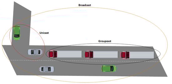 Some use cases shown in Table 1 and Table 2 can be associated with green transport solutions. For example, use cases defined for LTE V2X such as Automated Parking System and V2N Traffic Flow Optimization reduce the time a vehicle is circulating on a road and, therefore, decrease greenhouse gas emissions, reduce energy consumption in the case of battery-powered vehicles, reduce tire wear and contribute to the reduction of traffic jams. In addition, the exchange of vehicle information with road traffic management platforms can be useful to avoid traffic jams and recommend alternative routes that reduce travel time. For this, it is necessary that this information is constantly updated and from this information it is possible to generate traffic prediction algorithms to anticipate events. With respect to use cases defined for 5G V2X, Advanced Driving services enable vehicles, user devices and infrastructures to manage communications for the smooth movement of vehicles on the roads. For example, at an intersection, two vehicles can manage a traffic priority, thus avoiding the need for one or the other vehicle to stop and restart. For Vehicle Platooning (autonomous or semi-autonomous), it has been demonstrated that through proper coordination in the separation and speed of the vehicles, fuel consumption and gas emissions can be reduced. For this purpose, it is necessary that the vehicles belonging to the platoon manage communications among themselves and with other surrounding vehicles. Such communications must be carried out in unicast, groupcast or broadcast modes, as shown in Figure 2.