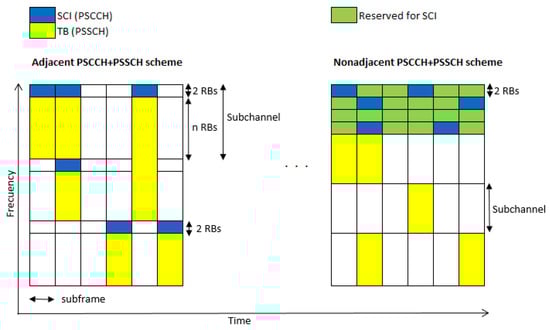 Additionally, the concept of subchannels is used, which represent a set of n RBs in the same subframe. Such subframes can be used for the transmission of both data and control information in V2X communications. Specifically, data is transmitted via Transport Blocks (TBs) and control information via SL Control Information (SCI) messages. TBs are mapped via Physical Sidelink Shared Channels (PSSCHs) and SCIs via Physical Sidelink Control Channels (PSCCHs) [8]. The information carried by an SCI is related to the type of Modulation and Coding Scheme (MCS) used in the TBs, Frequency Resource location of initial and retransmission, resource reservation, retransmission index, etc. Therefore, the transmission of a TB with its corresponding SCI in the same subframe is mandatory [13]. LTE V2X defines two subchannelization schemes: adjacent PSCCH + PSSCH and nonadjacent PSCCH + PSSCH, as shown in Figure 3. In the first one, an SCI, which occupies two RBs in frequency, is transmitted in adjacent RBs with corresponding TBs. The number of RBs occupied by the TBs depends on the type of message to be transmitted, e.g., Cooperative Awareness Message (CAM) messages. In the second subchannelization scheme, different resource pools are used to transmit SCIs and TBs. In both schemes, it is understood that for each TB mapped in a subframe, its corresponding SCI is also transmitted. In addition, it is possible to transmit several sets of TB + SCIs in the same subframe.