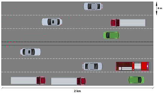 Our interest was to perform simulations based on the use of LTE-V2V mode 4. This is because, through this unassisted mode, vehicles must manage the resources to be used in situations where there is no cellular network coverage. For this purpose, a scenario is considered in a highway whose conditions are based on the recommended in [21]. Thus, it is considered a two-way highway with three lanes in each direction (see Figure 5). The length of the highway is 2 km, and each lane has a width of 4 m. In this sense, different vehicle densities (in vehicles per meter) can be configured to consider highway fast (0.06 vehicles per meter (vpm)) and slow scenarios (0.12 vpm).