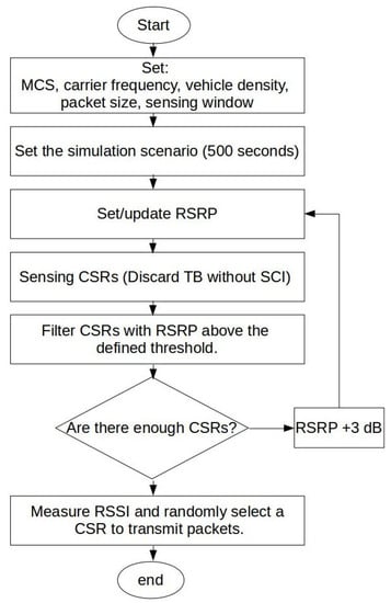 Figure 6 shows a flow chart with the main steps that are followed to obtain the results. In order to prevent all vehicles from transmitting the first message at the same time, a delay varying from 0 to 1000 ms is configured in the first packet. Then, all vehicles transmit and receive alert messages based on the resource selection and congestion control processes defined for mode 4. CAM packets of 190 bytes are sent in multicast mode with different transmission frequencies. To determine the number of RBs to be used to transmit each packet, both the MCS and the packet size are considered. Thus, the TB defines the number of RBs needed to transmit each packet. To this number of packets must be added the 2 RBs needed to transport the SCI (i.e., adjacent PSCCH/PSSCH). To obtain the PSSCH-RSRP, Power Spectral Density (PSD) of the RBs is multiplied by the bandwidth of each Resource Element (RE). Thus, the PSSCH-RSRP is calculated as the average power for each RE assuming that the power is equally distributed over all the REs. On the other hand, for the RSSI calculation, power noise and interference are considered for each RB. Thus, RSSI is equal to the sum of the received power per RB multiplied by the total number of transmitted RBs.