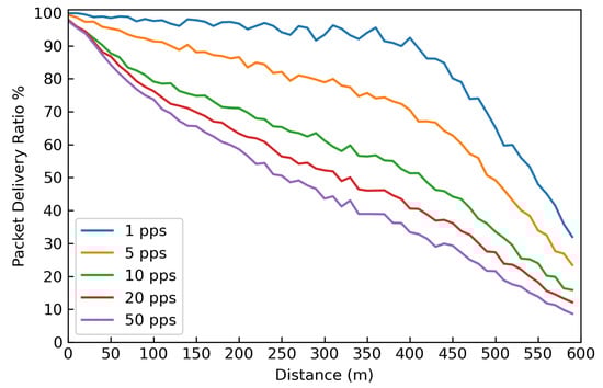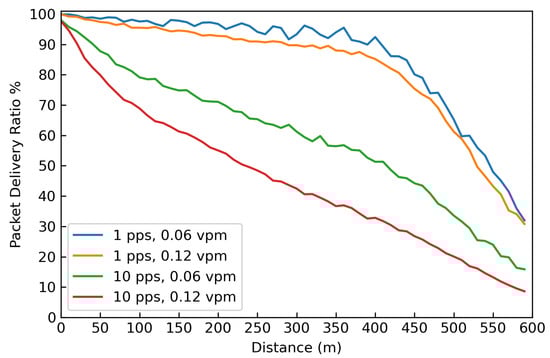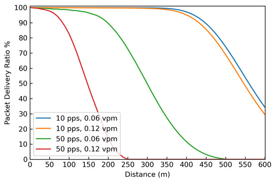 Figure 11 shows the variations of PDR considering different densities of vehicles on the road. In this case, in slow scenarios the PDR are significantly affected compared to highway fast scenarios due to a higher density of vehicles on the road. However, for 50 pps, a PDR above 80% is guaranteed for distances less than 100 m.