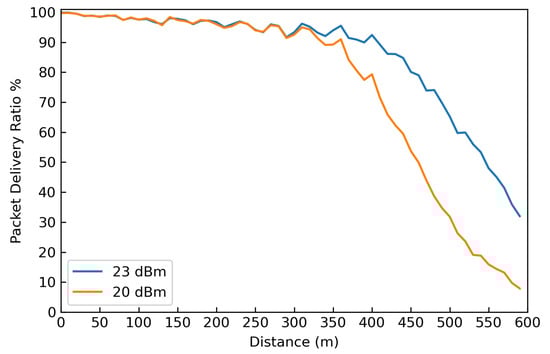 In Figure 9, we analyze the effect of transmit power on the PDR for different propagation distances. In this case, a fast highway scenario with a transmission rate of 1 pps is considered. It is verified that when the transmit power decreases from 23 dbm to 20 dBm, the PDR levels are similar for distances below 300 m. However, longer distances lead to higher packet losses.