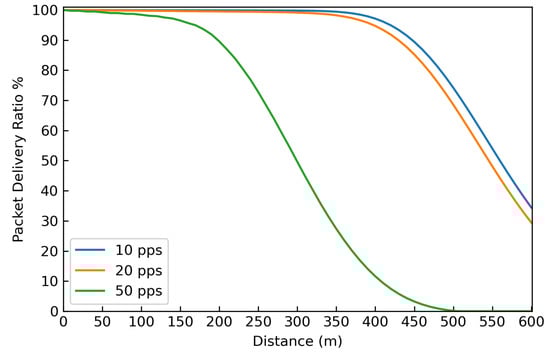 The reference parameters considered in the model are the same as described in Table 3. Thus, Figure 10 shows the variation of the PDR as a function of distance for different packet transmission rates in mode 3. A vehicle density of 0.06 vpm on the road is considered. The results show, as in mode 4, that increasing the packet transmission rate limits the distance range for a given PDR. However, in all cases, the performance of mode 3 is better than mode 4. For packet transmission rates of 10 and 20 pps, the PDR is above 95%. For 50 pps, the same PDR level is maintained, but the coverage range is limited to 200 m.