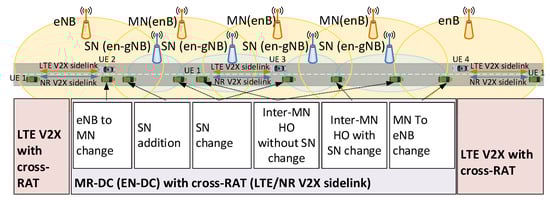 When building on the multi-connectivity operation options using E-UTRA and NR radio access technologies proposed by 3GPP Technical Specification (TS) 37.340 [7], several MR-DC multi-RAT scenarios may be envisioned, which encompass both LTE V2X sidelink communications and NR sidelink communications. However, note that in Rel-16 only the Master Node (MN) is allowed to control and configure the UEs performing NR sidelink communications and or LTE V2X sidelink communications [7]. This implies that the Secondary Node (SN) is not allowed to use (initiate) an E-UTRA Radio Resource Control (RRC) Connection Reconfiguration procedure or an NR RRC Reconfiguration with sidelink fields for LTE sidelink or NR sidelink. That the MN would be the entity in charge of receiving this control signaling yields three option (Figure 13):