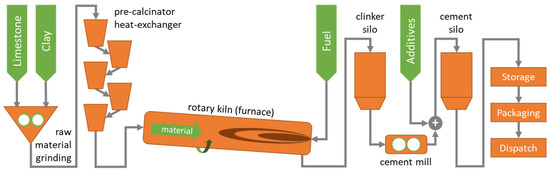Figure 4 depicts in a simplified way the cement production process considered in this test case. The main raw material of the process is limestone that is ground at the input of the process. Clay is also added to the input, among other materials, to stabilize the kilning process and give the cement the required characteristics. After a pre-heating process, the raw material mix goes through the rotary kiln where the calcination occurs to produce clinker. The clinker is then milled to produce cement that is packed and ready to dispatch.