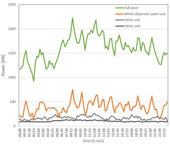 Figure 7 shows the total factory consumption and the partial consumptions of the several industrial areas for a period of 24 h, highlighting the total energy consumption and the white dispersion paint unit. The other two plots are the third and fourth most representative (the others following are not represented in the figure). After analyzing these consumption data, it was concluded that the white paint dispersion unit, from which all other colored paints are made, is the most energy-relevant sector of the factory. Therefore, this sector was selected to test the proposed approach.