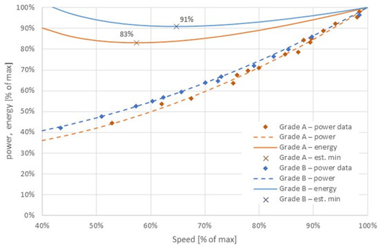 Figure 9 depicts normalized power and energy data for two different paint grades. The dotted lines are estimated quadratic power curves for different equipment speed regimes (diamond markers). The solid lines represent the estimated normalized total energy and are obtained from the power curves dividing by the speed (as the necessary time to mix the product to the same number of turns is inverse of speed). The visibility of these curves separated by product grade (context variable) brought awareness of the potential savings.