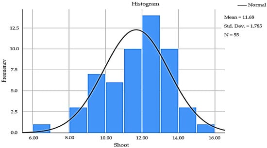 Based on the statistically computed data (Table 2), as the Kolmogorov–Smirnov and Shapiro–Wilk are greater than 0.05, it can be stated that the normality curve is symmetric [41,42], as presented in the histogram (Figure 1).