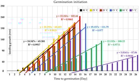 Temperature is critical in determining the duration of germinating [43,44,45]. The findings indicate that seeds accumulate the heat units from the thermal energy they absorbed, and once they reach the necessary level to initiate metabolic activity, germination begins at a pace dependent on the ambient temperature condition.