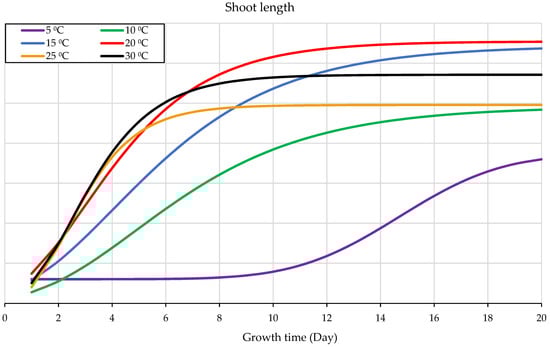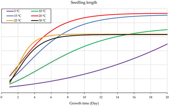 The most salient performance values and the most outstanding seedling development rate appeared at 20 °C compared to the other tested constant temperatures (Figure 2 and Figure 3). Sigmoid curves, Figure 3, demonstrate that seedling development under 15 °C followed a similar pattern to that at 20 °C, but with a slightly lower growth rate. However, the seedling development under more than 25 °C had a reverse effect on seedling development, which is in line with other studies [57,58]. There are discrepancies with other research that reported a broader optimal range owing to day–night temperature fluctuations. However, this present research presents the accumulation of the temperature in vitro at a constant temperature, which explains the narrower. For the same reason, seedling development needed a longer time with a lower growth rate. Although nearly identical development pattern to that of the 10 °C was presented at 25 °C and 30 °C, nonetheless, it was far faster (Figure 3); it is because of the reverse impact of the high temperature on enzymes activity, protein synthesis, and biochemical energy content increased and ROS formation, not because of the temperature accumulation [59]. The slightly analogous of seedling development under 25 °C and 30 °C presents that their growth rate was rapid in early stages but slowed in later stages (Figure 3). It indicates that each stage of wheat seedling development needs a different temperature. This figure illustrates that the upper germination range of 25 °C and 30 °C gives quicker germination and early seedling growth within less than five days, but not for the subsequent seedling growth phase. In brief, the best fitting starting point for seedling growth is 20 °C with a high development rate (Figure 3).