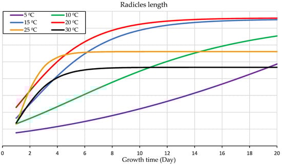 The seedling’s shoots and radicles showed the same development performance at and close to the optimal range of temperature; however, their growth pattern differs when the indicator arrow of the temperature crosses the optimum limits of growth range tails (Figure 4 and Figure 5). The shoot formed and developed better, especially in the very early growth stage, than the radicle under a temperature scope higher than the optimum range (Figure 4). However, the radicle has a distinct growth pattern and need for temperature compared to the shoot because it grows better at temperatures lower than the optimum range, particularly in the later stage than the shoot (Figure 5).