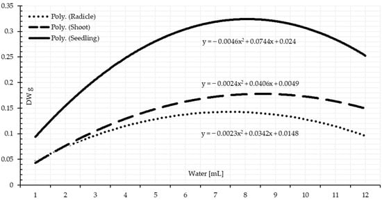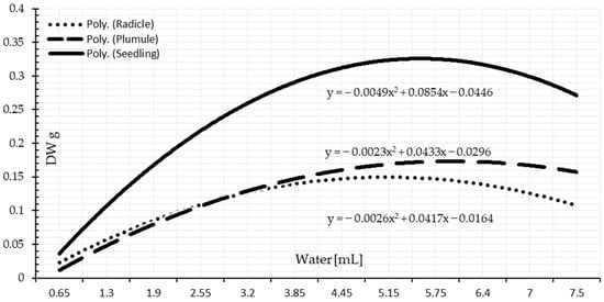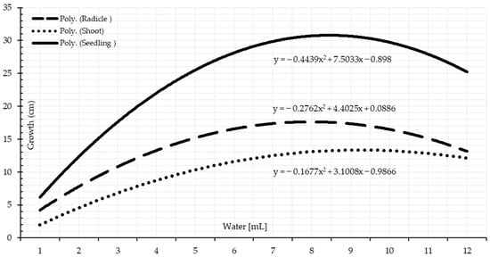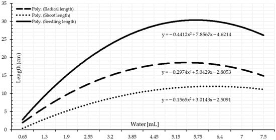 Significant differences among the seedling performance depending on supplied moisture percentages were observed. As the water was applied at the lowest quantity necessary, the seedling length had the lowest mean values, and as water quantity increased, seedling development significantly increased, as presented in Table 3 and Table 4. The ideal moisture content range begins at 3.85 mL, or 450% of TKW, as shown in Table 4. Parallel to this, significant seedling length performance started under 5 mL according to water quantity applied based on single-milliliter intervals. In the same pattern, significant seedling performance started under 5 mL according to water quantity applied based on single-milliliter intervals. Water stresses of drought or waterlogging significantly reversely affect seedlings’ vigor, seedling length values rises dramatically at the starting point of the ideal range of water application, and moisture percentage based on the TKW is more accurate and reliable. Water stress reduces enzymatic activity, which has a deleterious effect on glucose metabolism, decreases water potential and soluble calcium and potassium, and alters seed hormones [69,70,71]. Since all of these intracellular mechanisms are affected by the water stress, the seedling growth rate finally deviates from the average growth and reduces.
