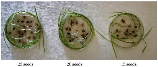 This part was designed to study the seed’s number effect on the germination performance under the same quantity of water. Three sets of seeds, 15, 20, and 25 per P.D, were placed in Petri dishes. First, they were treated with 6 mL of distilled water. Ten replications were implied to reduce the experimental error of the experiment and boost the accuracy. Then, they were incubated at a constant temperature of 20 °C in a controlled germination chamber. The measured traits were categorized into four groups: number of seeds that were not germinated, number of germinated seeds with the only radicle, seedling with short shoots (less than 4 cm), and normal seedling. The normal seedling term refers to the morphological stage compared to the other in the same condition: the seedling with taller shoots than 4 cm. These categories were made to achieve an aggregated value according to Equation (2) [40]: