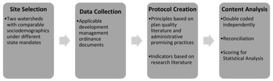 We build upon the conceptual framework offered by the plan quality literature to identify a set of ordinance quality principles and examine riparian buffer provisions within development management ordinances adopted by 22 local governments in two watersheds in Maryland and North Carolina. Two research questions guide our research: (1) To what extent do the buffer protection provisions within development management ordinances incorporate scientific information and promising administrative practices and (2) are socio-demographic characteristics associated with higher-quality ordinances? The study includes population size, population density, growth rate, median income, median housing value, and planning capacity, which other studies identify as variables with an impact on plan quality [4,23,24,25,26]. The study jurisdictions are in two states planning under different single purpose state mandates, allowing the investigation of differences in ordinance quality at the state level.