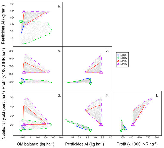 The current position of MPF and MDF farms belonging to marginal farm types and their solution spaces with respect to four objectives, i.e., to maximize operating profit, increase soil organic matter balance, increase dietary energy yield (nos. persons fed ha−1), and minimize pesticide use, is presented in Figure 1. The result of the exploration provided relations between objectives in a cloud of solutions in two-dimensional space for both marginal farms (MPF and MDF). Both MPF and MDF farms had opportunities to improve performance for all objectives (Figure 1). The improvements that could be attained were larger when prototype cropping systems were added. The MPF farm could benefit greatly in terms of improvements in soil organic matter balance (Figure 1a,b,d).