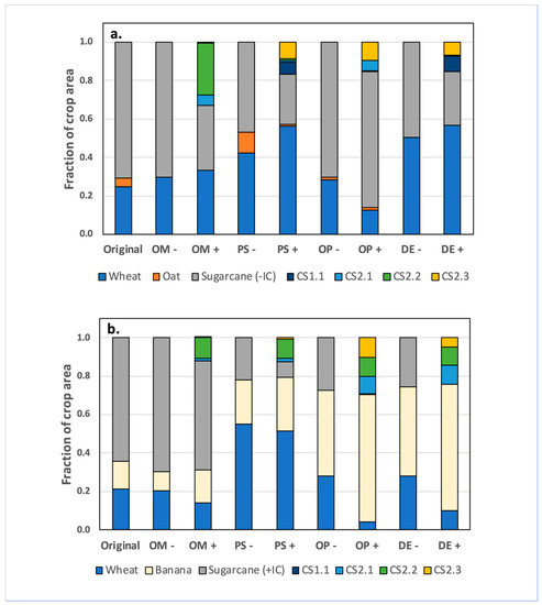 Crop area distribution for extreme solutions for the MPFs (a) and MDFs (b) with the highest organic matter balance (OM−, OM+), operating profit (OP−, OP+), and dietary energy yield (DE−, DE+) and lowest pesticide input (PS−, PS+), from exploration without (−) and with (+) intervention crops from prototypes—solutions that perform better than the original for all objectives. CS1.1: Rice–Mustard, CS2.1: Sorghum (Green fodder)–Oat–Sesbania (GM), CS2.2: Sorghum (Green fodder)–Chickpea–Sesbania (GM), CS2.3: Maize + Redgram − Wheat + Mustard-Sesbania (GM), IC, intercrop.