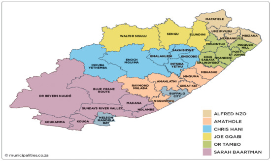 Municipalities in the Eastern Cape Province. Available online: www.municipalities.co.za (Accessed on: 15 February 2022).
