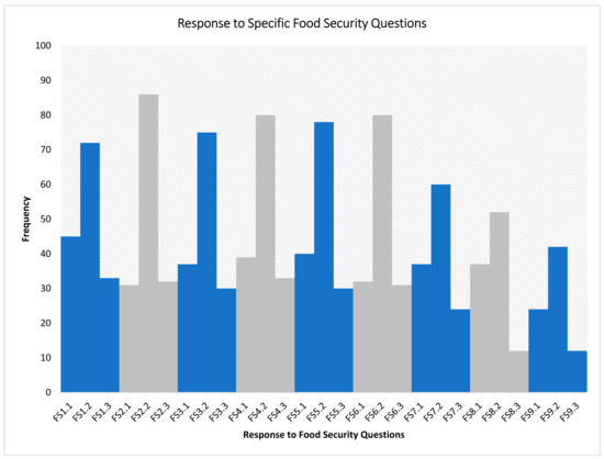 Table 3 and Figure 2 indicate the responses to the food security questions. According to the HFIAS, the questionnaires employed a series of 9 to 15 questions that detected the level of concern and availability, accessibility, variety, and/or quantity of food. Their aim was to assess whether households had experienced problems with accessing food over the previous 30 days. There were two sub-questions in the questionnaire. The first group of questions were the nine occurrence questions, and the respondent could reply with either ‘yes’ or ‘no’ (where no = 0 and yes = 1). The HFIAS highlights a household’s concerns about the likelihood of food insecurity, which includes inadequate quality and inadequate amounts of food. A food-secure household is defined as one that is able to secure enough food to ensure adequate intake for all of its members.