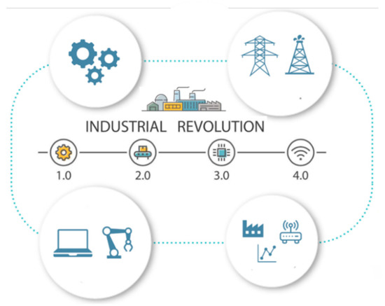 There are many applications of the IoT, or the IIoT, such as home automation, the Internet of Vehicles, fleet telematics, fuel telematics, digital card-based e-healthcare systems [41], smart car parking, etc. The IoT implementation in the industrial sector has led to the automation of the business operations and activities [21]. An overview of IIoT- and Industry-4.0-based applications is illustrated in Figure 2, which depicts the evolutions of the robotics, electronics, electricity, and mass production industries by the advanced implementation of the IoT.